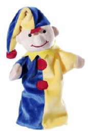Die Stoffhandpuppe Kasperl ist bekleidet mit einem blau/ gelbem Anzug mit roten Knöpfen und trägt eine Mütze.