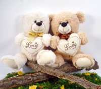 Der kuschelige Teddybär ist bekleidet mit einer Schleife um den Hals und trägt ein Herz-Kissen in seinen Händen mit der Aufschrift "Love".