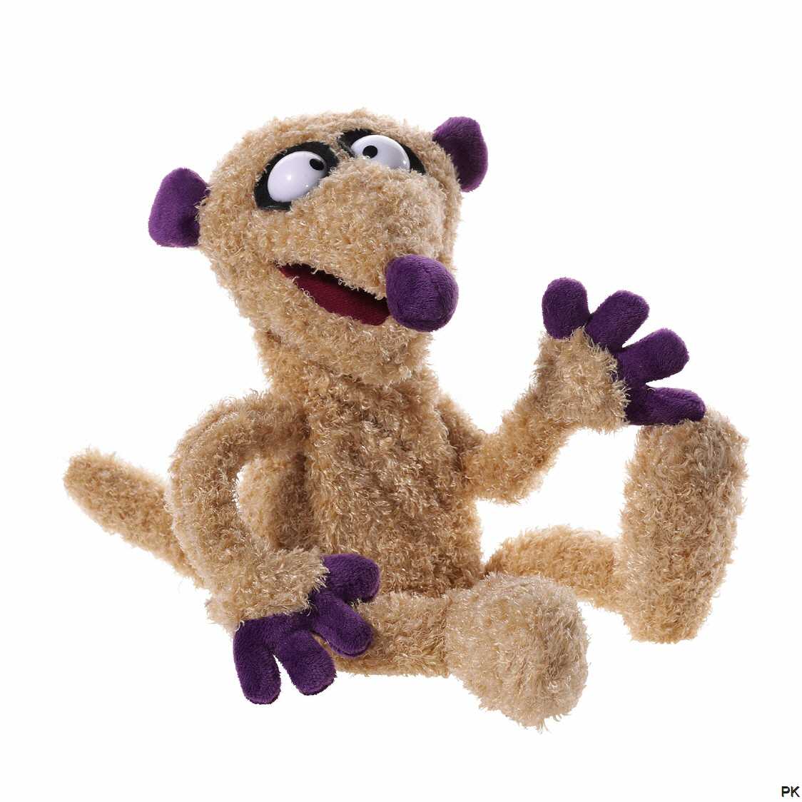 Mit seinen großen Augen und den violett abgesetzten Körperpartien schaut die Plüschhandpuppe "Jan" süß und lustig aus.