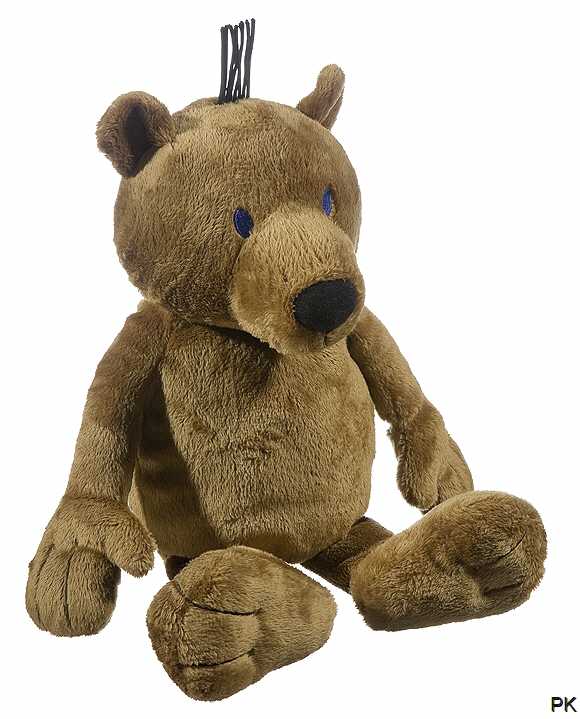 Am Kopf hat der Pluesch Baer Janosch einen fadenartigen Haarbüschel,