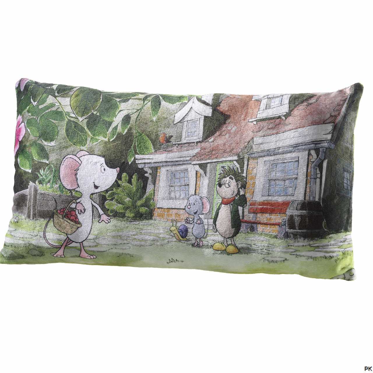 Auf dem Kissen ist ein photorealistischer Motivdruck "Tilda Apfelkern" abgebildet.