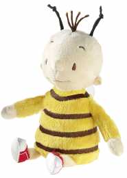 Das Plüschtier 'kleine Hummel Bommel' hat ein gesticktes Gesicht, kleine Flügel und rot/weisse Schuhe aus Stoff.