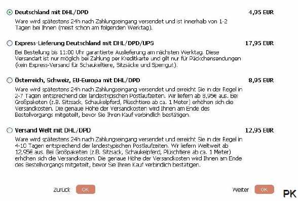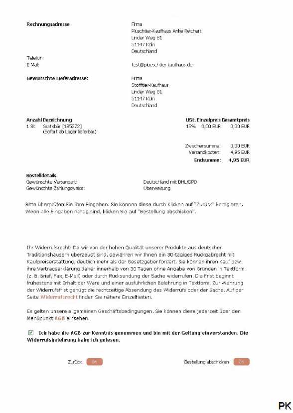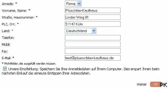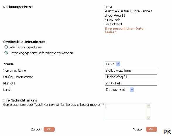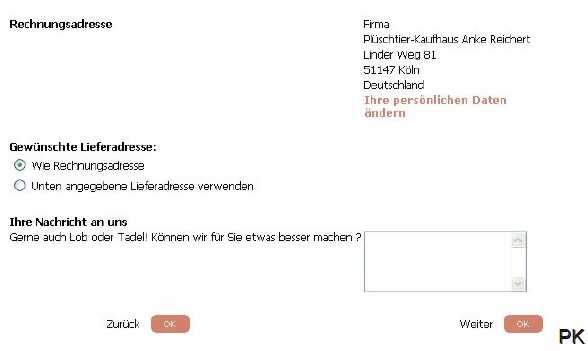 1. Auswahl der Artikel, die Sie kaufen möchten: 1.1 Wählen Sie Ihre gewünschten Artikel aus, indem Sie die Artikel in den Warenkorb mit einem Mausklick auf das Feld "In den Warenkorb" legen. Sie können sich auch jederzeit über den Inhalt Ihres Warenkorbes informieren, indem Sie auf das Feld "Warenkorb anzeigen" klicken, dass immer in der oberen Statusleiste angezeigt wird. 1.2 Wenn Sie Ihren Einkauf abgeschlossen haben, können Sie mit einen Mausklick auf das Feld "Zur Kasse gehen". Ihre Bestellung beginnen. Das Feld "Zur Kasse gehen" wird auch immer oben rechts in der Statusleiste angezeigt. 2. Adresseingabe Bitte geben Sie auch eine gütlige E-Mail-Adresse an, da wir Ihnen eine Bestätigungs-E-Mail zuschicken, die Sie über Ihr 30-tägiges Rückgaberecht informiert und Ihre Bestellung mit allen Details für Ihre Unterlagen zusammenfasst. Die Angabe der Telefonnummer ist freiwillig, hilft aber eventuelle Rückfragen schnell zu klären. Das Plüschtier-Kaufhaus schreibt Datenschutz groß und garantiert Ihnen, keine Werbe-Emails oder Werbeanrufe zu tätigen. Ihre Daten werden nur zur Auftragsabwicklung verwendet, nicht an Dritte weitergegeben und zu Ihrer Sicherheit nach neustem Stand der Technik verschlüsselt übertragen. |