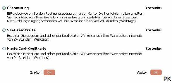 4. Zahlungsart wählen Wählen Sie die Zahlungsweise z.B. "Vorauskasse per Überweisung" oder ""Kreditkarte" 4.1 "Vorauskasse per Überweisung" Sie erhalten eine bestätigungsmail, auf der Sie unsere Bankverbindung finden. Sobald der Rechnungsbetrag unserem Konto gutgeschrieben wurde, werden die gekauften Artikel binnen 24h versendet. Sofern Sie über Onlinebanking verfügen, empfehlen wir Ihnen diesen Weg, um die Auslieferung an Sie zu beschleunigen. 4.2 "Kreditkarte (VISA oder MASTER)" Der Rechnungsbetrag wird von Ihrem Kreditkarten-Konto abgebucht. Bitte geben Sie dafür Ihre Kreditkartendaten ein. |