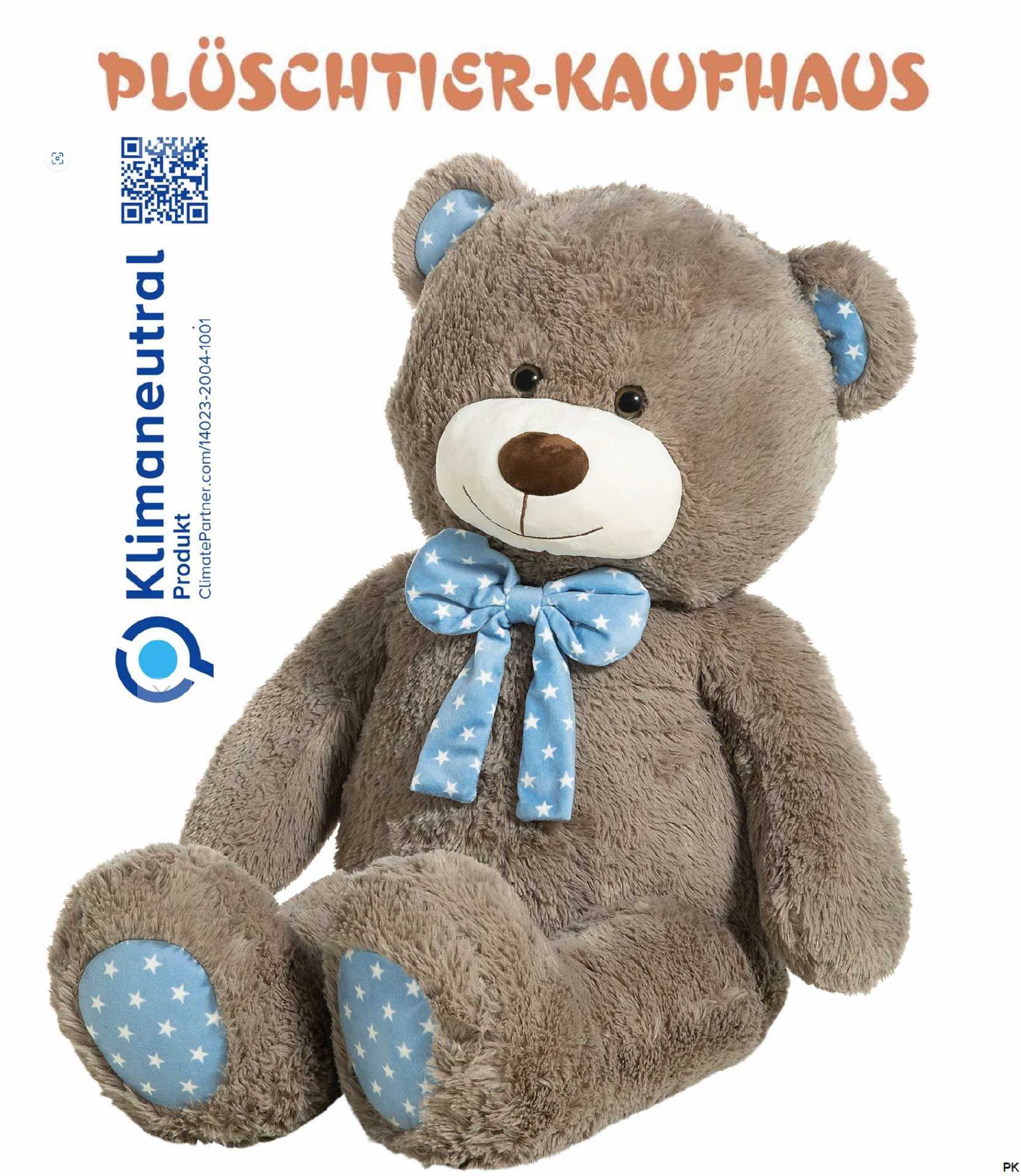 Der kuschelweiche grosse graue Teddy trägt ein blaues Sternenmuster. Zu finden ist es an der Innenseite der Öhrchen, an den Fußsohlen und am Schleifchen um ihren Hals.