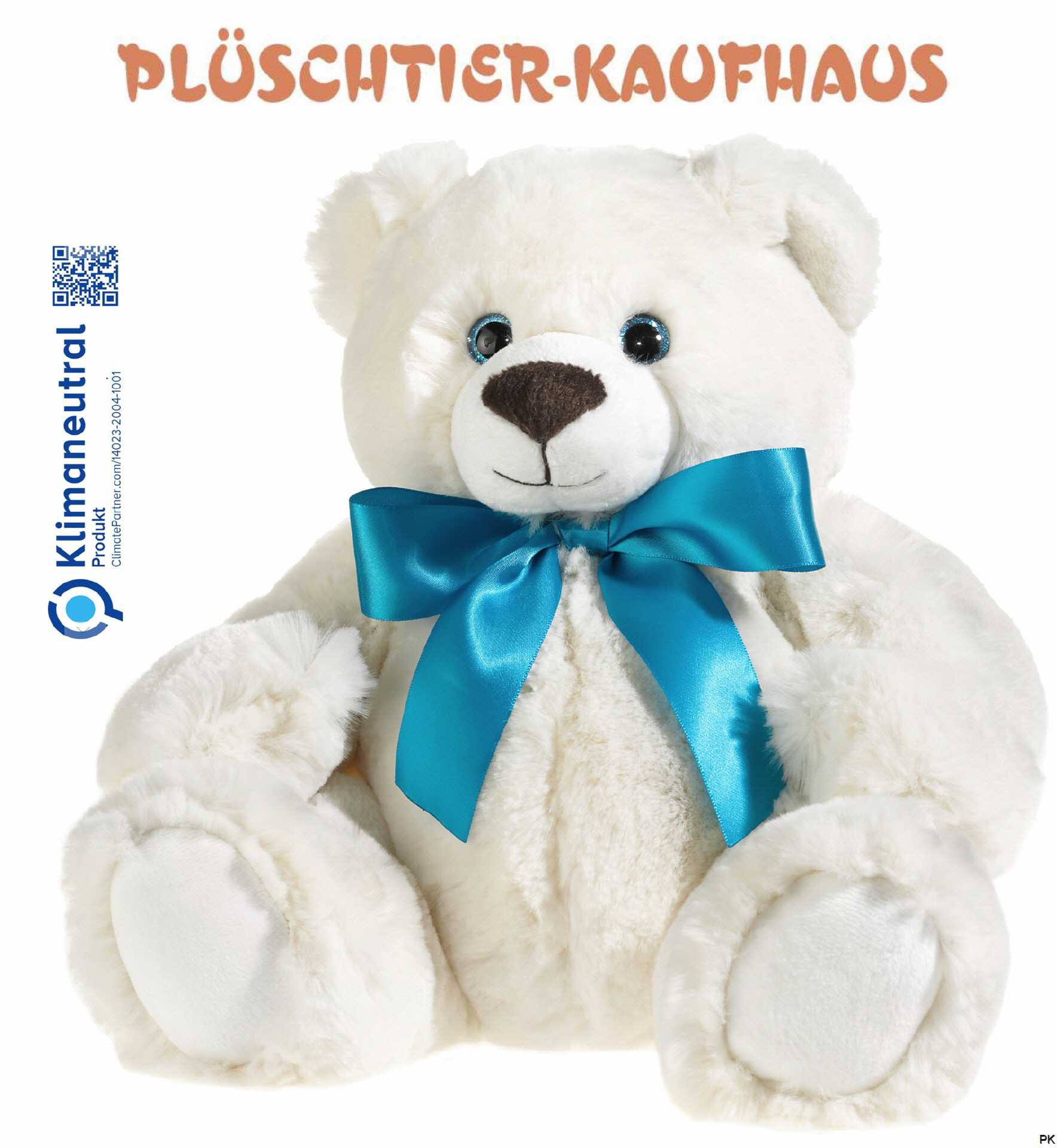 Der weisse superweiche und kuschelige Teddybär trägt eine edle blaue Schleife. Passend dazu haben die Augen einen feinen blauen Glitzerrand.