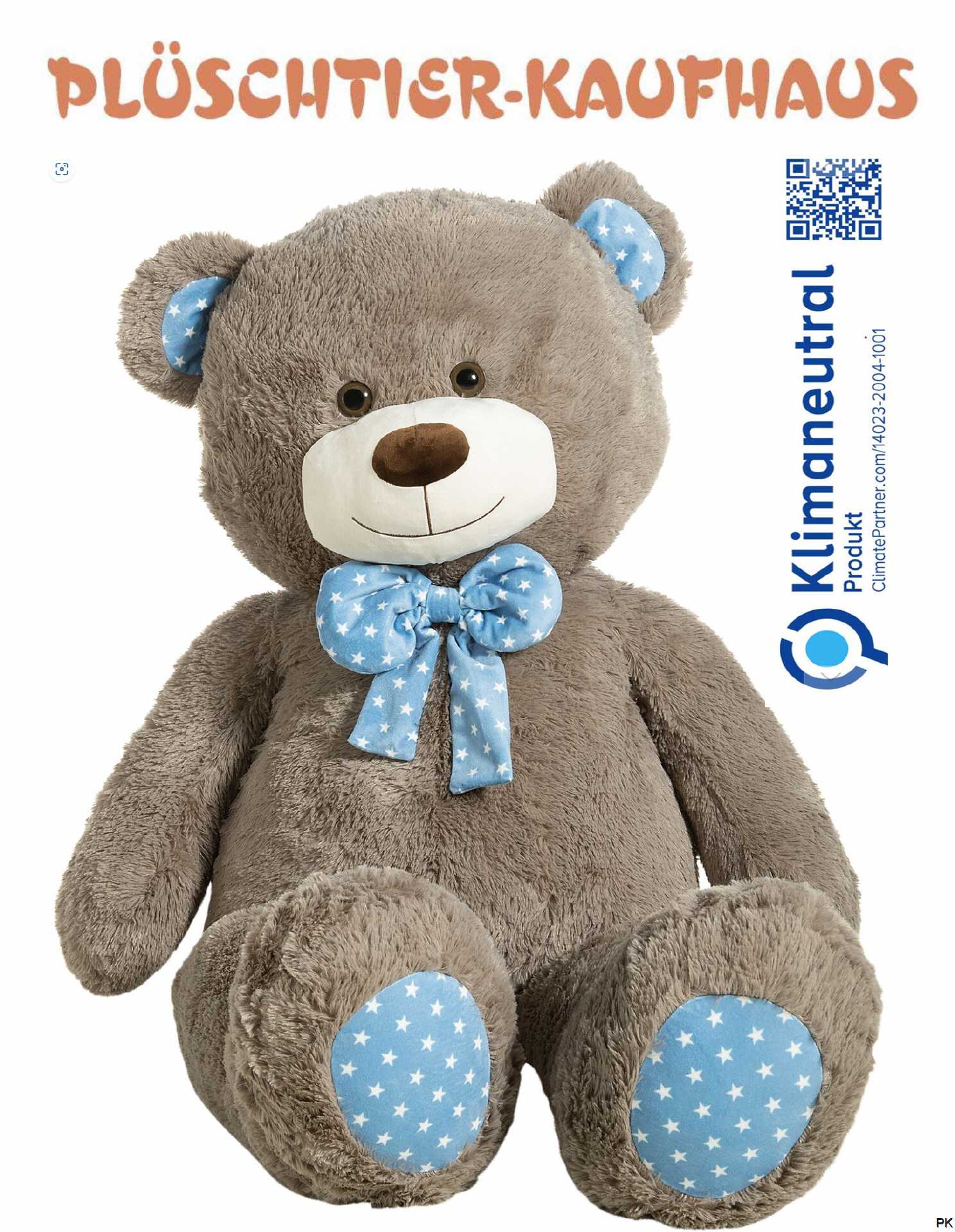 Der kuschelweiche grosse graue Teddybär trägt ein blaues Sternenmuster. Zu finden ist es an der Innenseite der Öhrchen, an den Fußsohlen und am Schleifchen um ihren Hals.