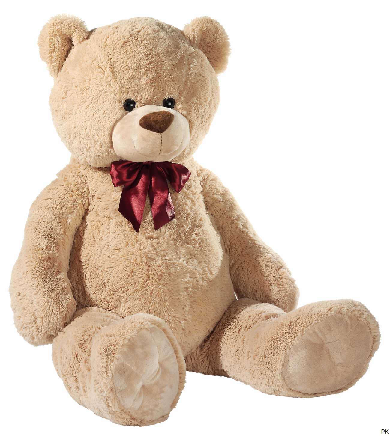 Die Schnauze, die Innenohren und die Fußsohlen des XXL Teddybären sind mit Softwool-Material abgesetzt. Der große Teddy hat eine braune Nase, schwarze Knopfaugen und ist mit einer Satin-Schleife um den Hals bekleidet.