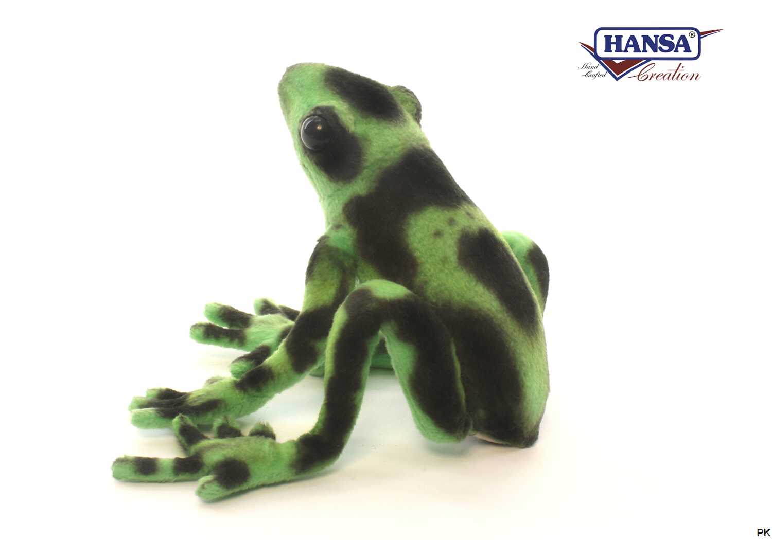 Der Plüschfrosch ist leuchtend grün gefärbt mit schwarzen Flecken.