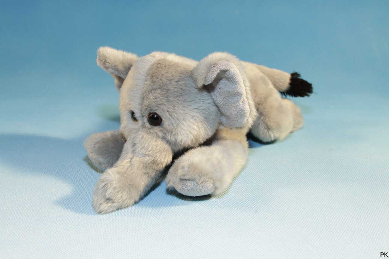Das Fell des Stofftiers Elefant ist grau. Die Knopfaugen und die Schwanzquaste sind schwarz.