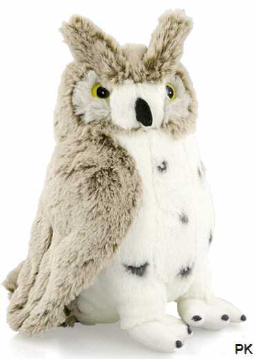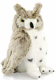 Das Stofftier Eule ist aus hochwertig verarbeitetem, langflorigem Plüsch hergestellt. Der Körper der Plüsch Eule ist rückseitig braun-meliert, vorderseitig weiß mit schwarzen Flecken. Die Gesichtsmaske der Pluesch Eule ist weiß. Die kuschelige Eule zwei schwarze Knopfaugen, die von einer leuchtend gelben Iris umrandet sind, die Nase ist schwarz.