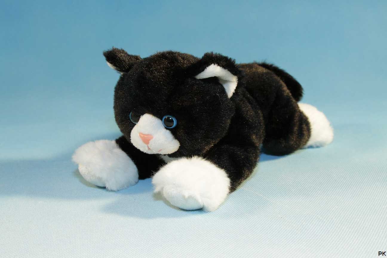 Das Fell des Stofftiers Katze ist schwarz gefärbt, die Knopf-Augen sind blau umrandet. Die Pfoten, die Schnauze und die Innenohren sind weiß abgesetzt. Die Nasenspitze der Plüsch Katze ist roséfarben.
