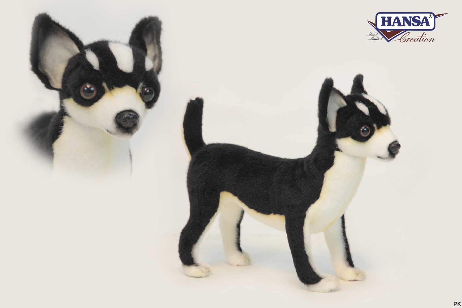 Plüschtier Chihuahua in stehender Position. Das Stofftier Chihuahua ist oberseitig schwarz, unterseitig beige gefärbt.