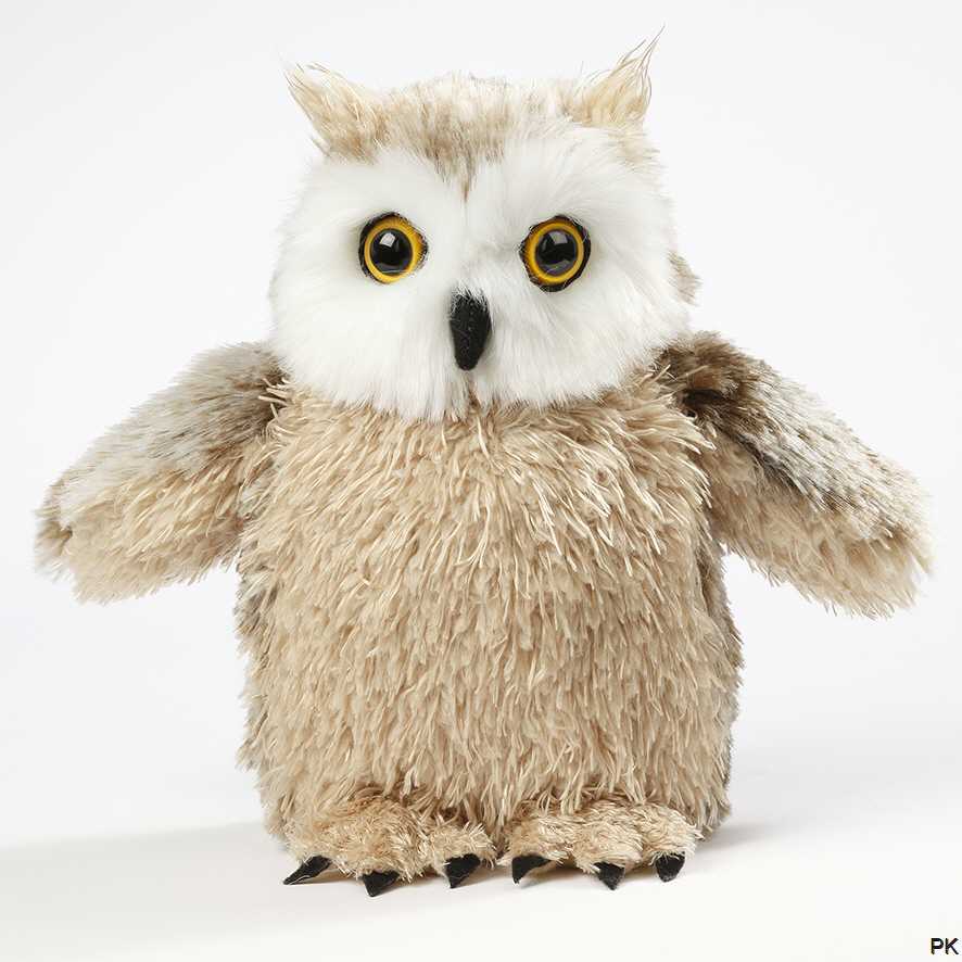 Das Stofftier Eule ist aus hochwertig verarbeitetem Softplüsch hergestellt. Der Körper der Plüsch Eule ist braun-meliert, das Gesicht weiß. Die Fuß-Krallen der kuscheligen Eule sind aus schwarzem Filz. Im Gesicht hat die Plüsch Eule zwei schwarze Knopfaugen, die von einer leuchtend gelben Iris umrandet sind, die Nase ist schwarz.
