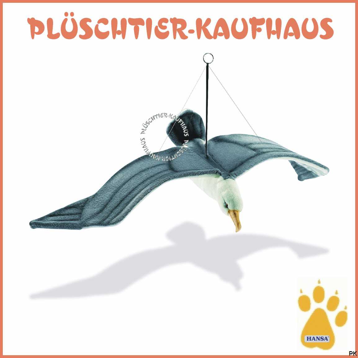Plüschmöwe in fliegender Position mit Vorrichtung zum Aufhängen.