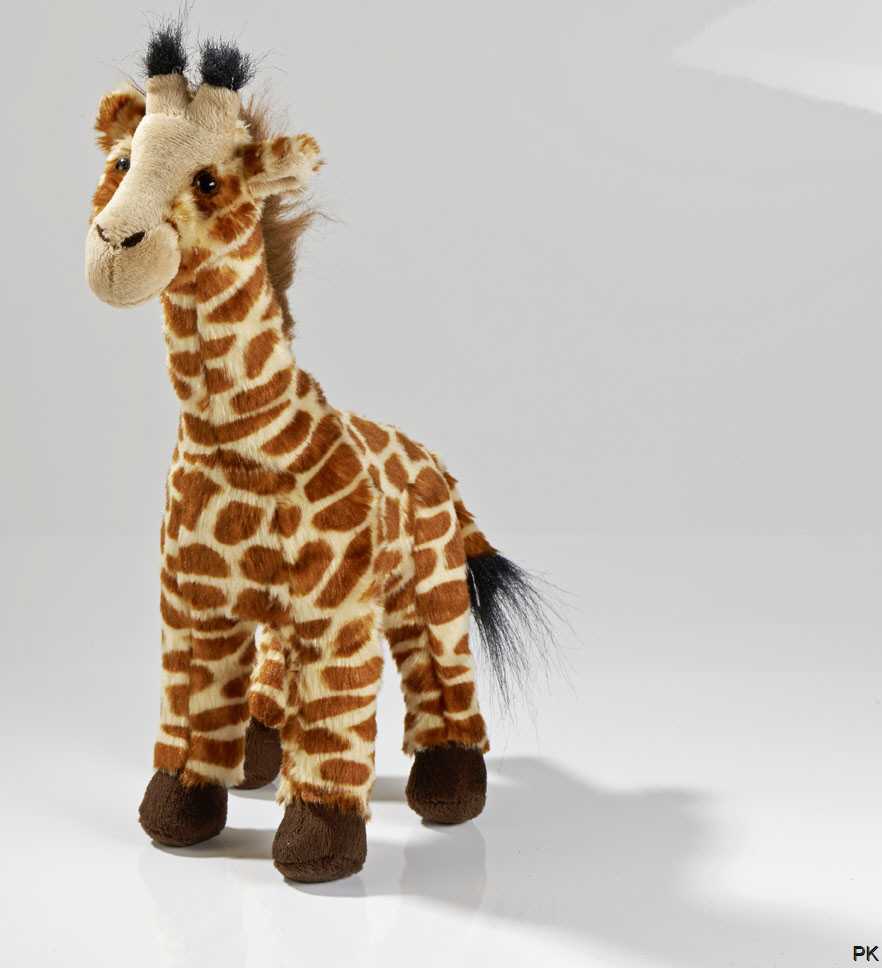 Das Fell des Stofftiers Giraffe ist weißlich, mit den markanten rotbraunen Flecken. Die Füße der Plüsch Giraffe sind dunkelbraun, ebenso der Schopf und die Nackenhaare. Der Schwanz und die Hörner der kuscheligen Giraffe enden in schwarzen Quasten, die Knopfaugen und die Nasenlöcher sind ebenfalls schwarz.