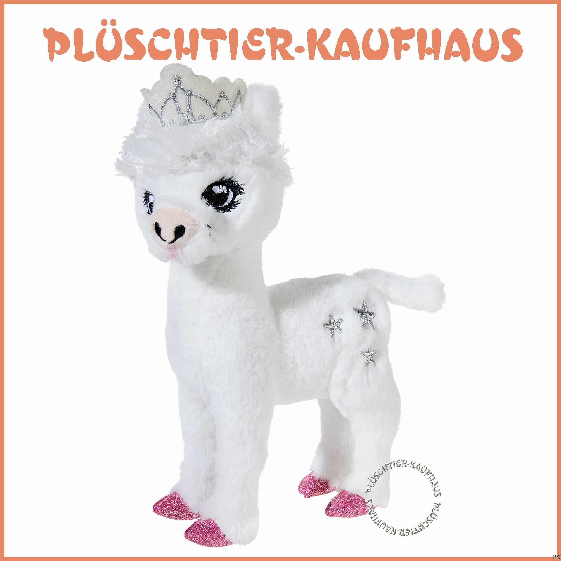 Das Stofftier Alpaka trägt eine glitzernde Krone und hat Sternchen und Pfötchen.