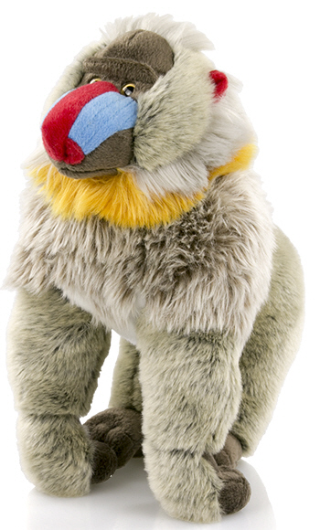 Das Stofftier Mandrill ist grau gefärbt, die Gliedmaßen, sind dunkelbraun gefärbt. Der kuschelige Mandrill hat einen gelben Kragen, eine dunkelbraune Gesichtsmaske und markante rot-blaue Nasenstreifen. Die Ohren des Plüsch Mandrills sind ebenfalls rot gefärbt.