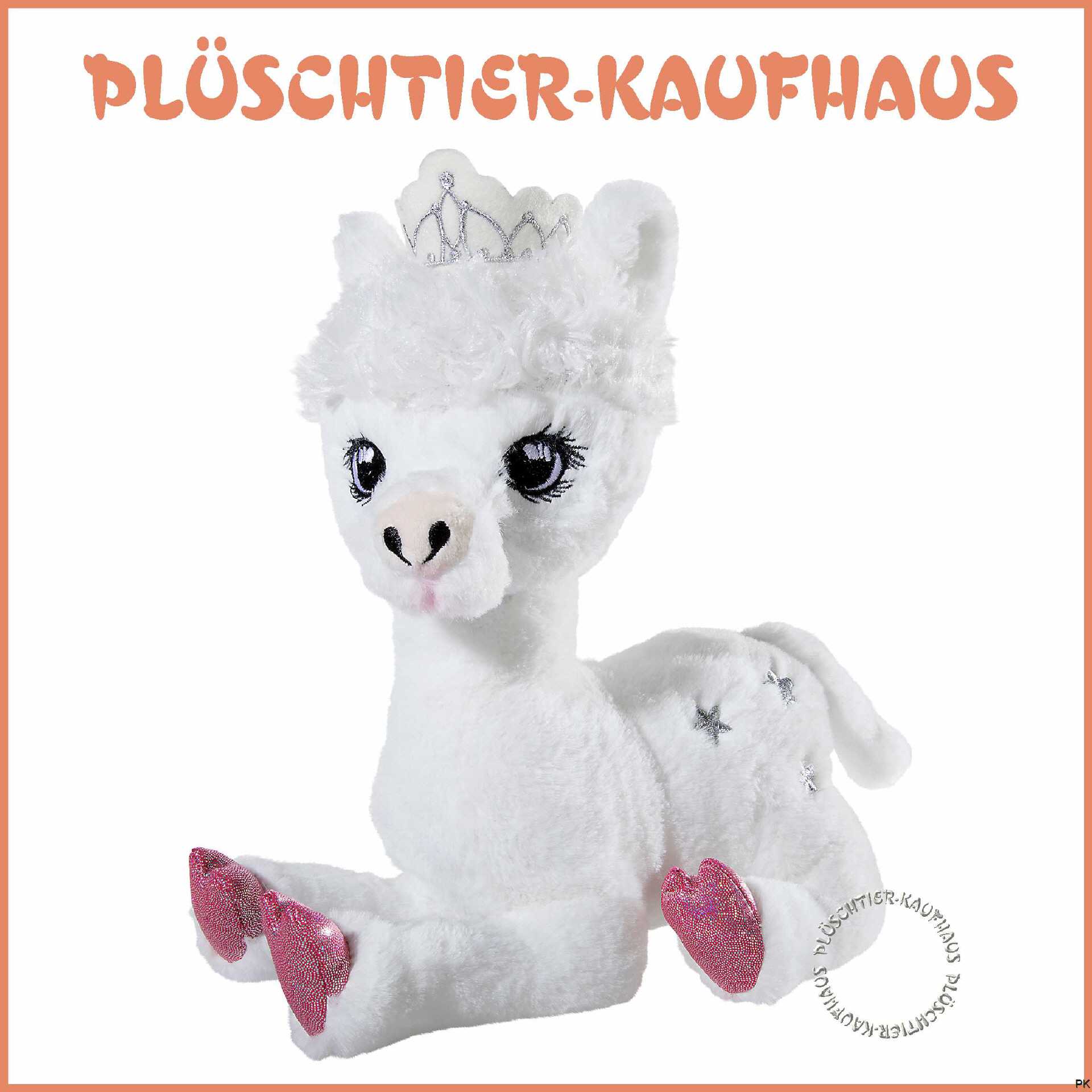 Das Stofftier Alpaka trägt eine glitzernde Krone und hat Sternchen und Pfötchen.