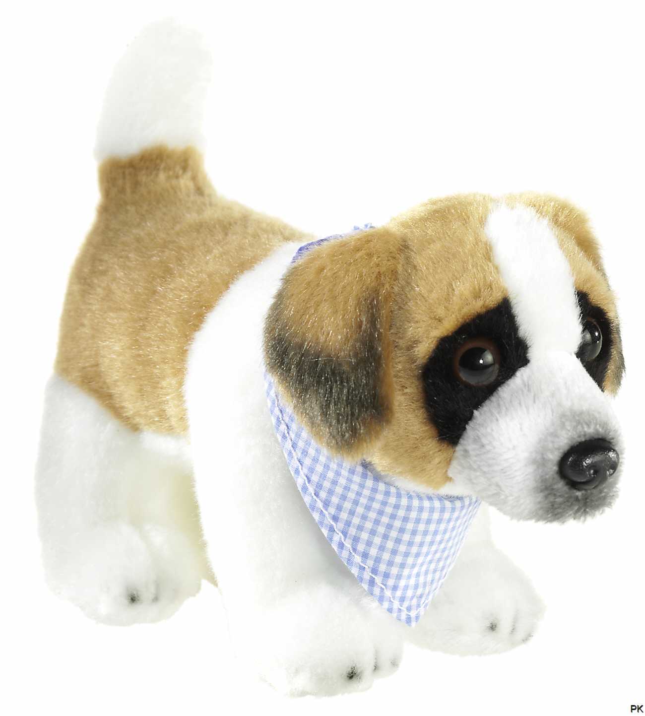Das Stofftier Bernhardiner ist mit einem karierten Halstuch bekleidet.