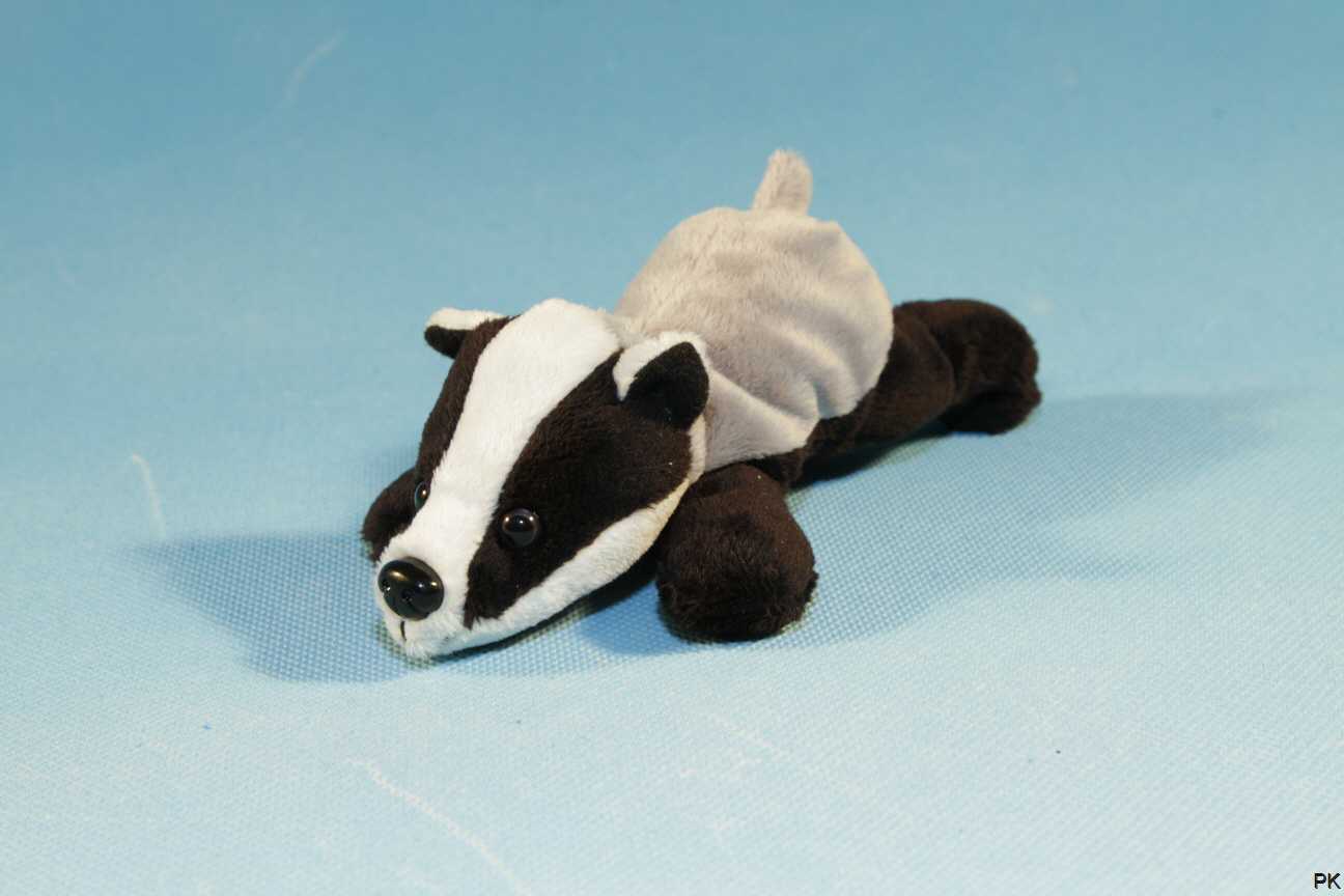 Das Stofftier Dachs ist schwarz, weiß und gräulich gefärbt und aus hochwertig verarbeitetem, kurzflorigem Plüschmaterial hergestellt.