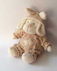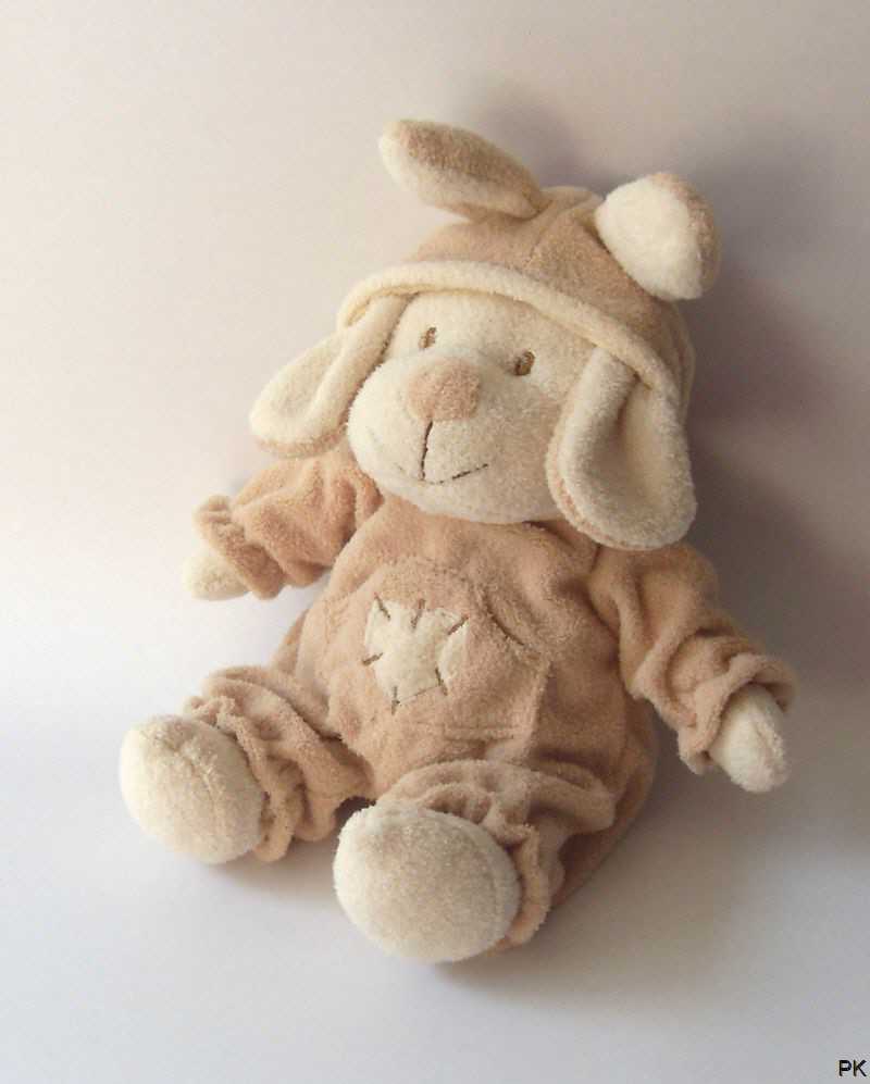 Der Plüschhund ist bekleidet mit Strampler und Kapuze.