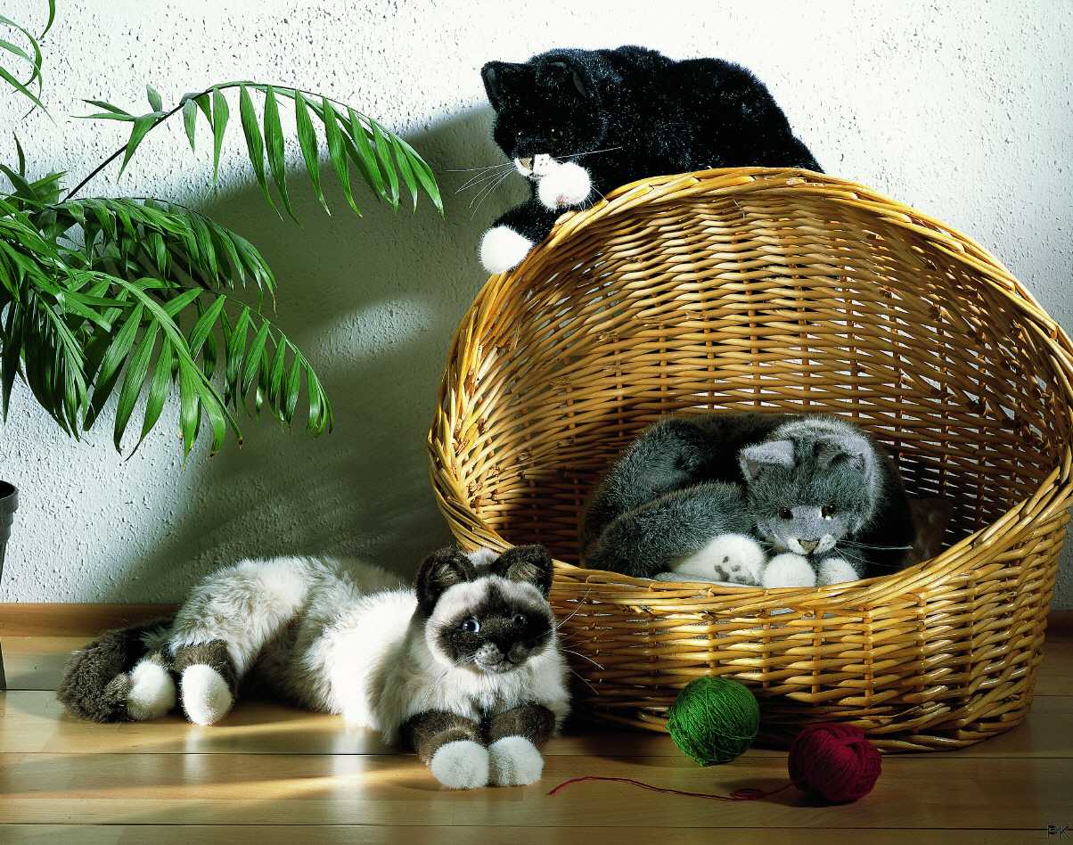 Die Katzen sind wie abgebildet in den drei Varianten " Birma Katze Sina" , "Katze Mohrle, schwarz" und " Katze Lucie, grau" (je 50 cm groß) lieferbar.