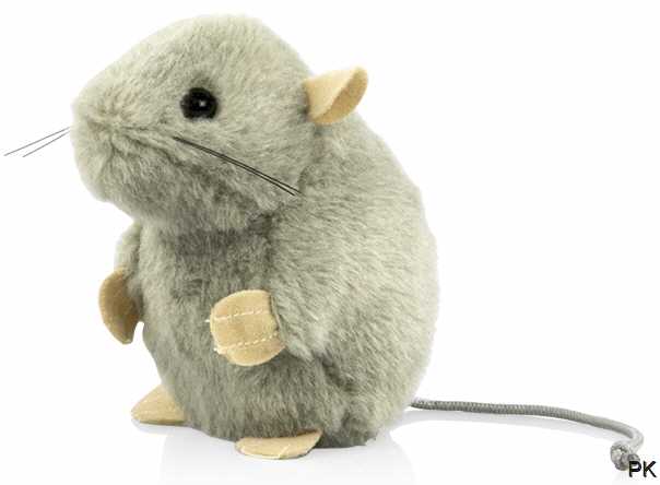 Das Stofftier Maus ist grau gefärbt, die Gliedmaßen, und Ohren sind hellbraun gefärbt.