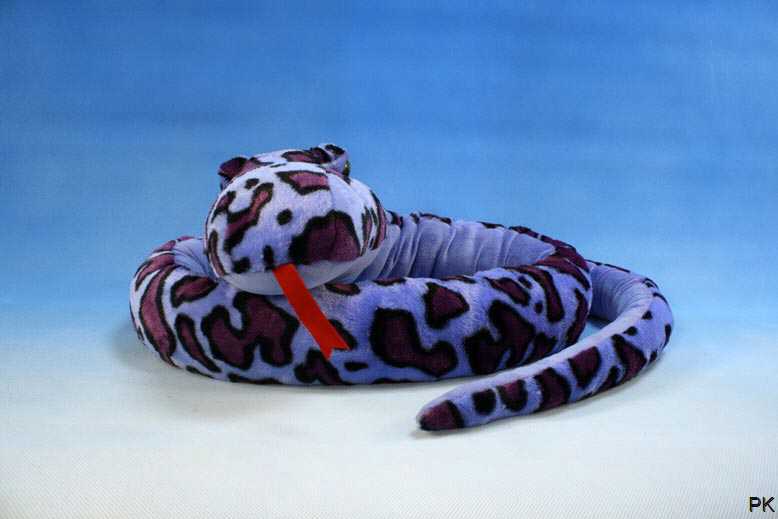 Plüschtier Schlange aus hochwertig verarbeitetem Plüschmaterial. Das Kuscheltier Schlange ist blau gefärbt, mit lila/ schwarzen Flecken.Größe Kuscheltier Schlange: 250 cm