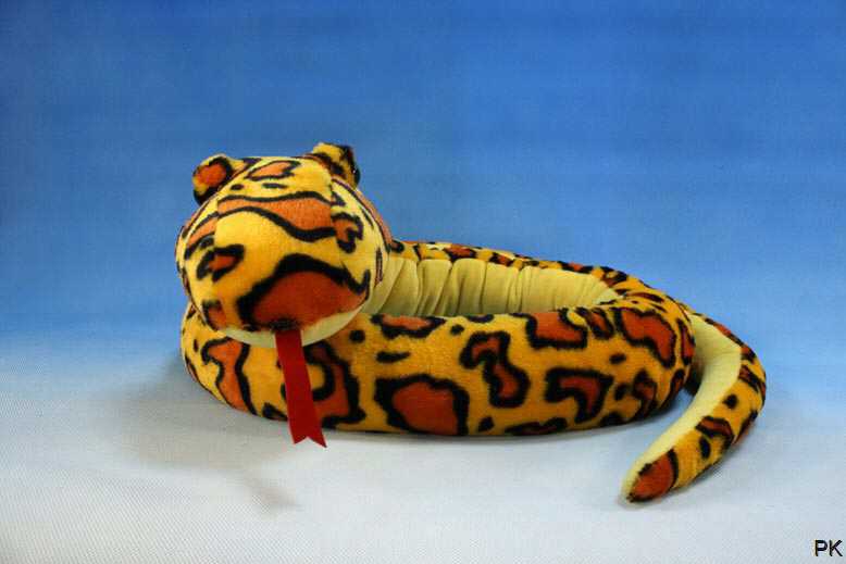 Plüschtier Schlange aus hochwertig verarbeitetem Plüschmaterial. Das Kuscheltier Schlange ist gelb gefärbt, mit braun/ schwarzen Flecken.Größe Kuscheltier Schlange: 250 cm