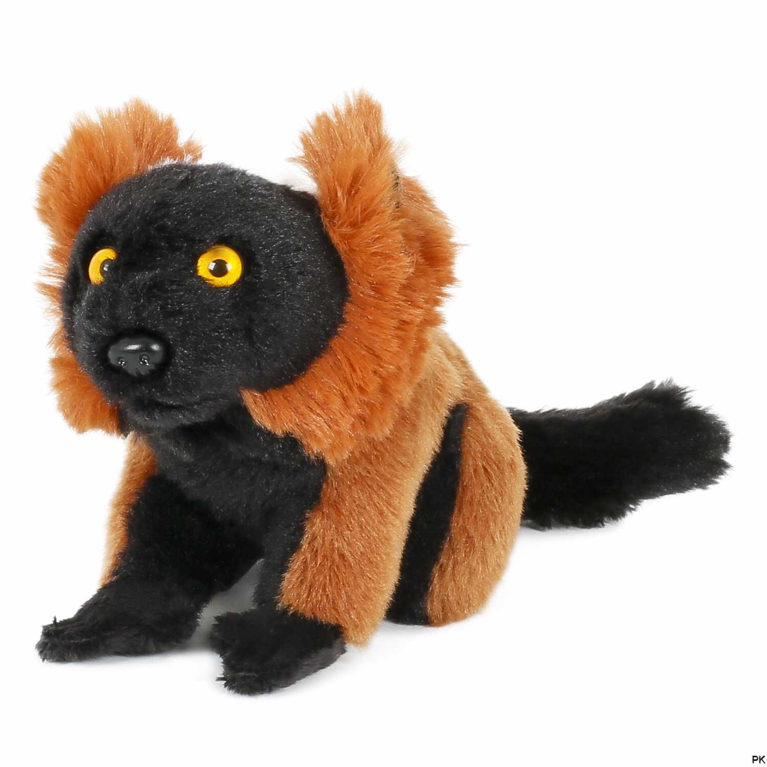 Plüschtier Roter Vari in sitzender Position. Der Plüsch Vari ist aus langflorigem Plüsch gefertigt und oberseitig rotbraun gefärbt. Unterseitig ist das Stofftier Roter Vari schwarz gefärbt und hat schwarze Knopfaugen, die von einer leuchtend gelben Iris umrandet sind.