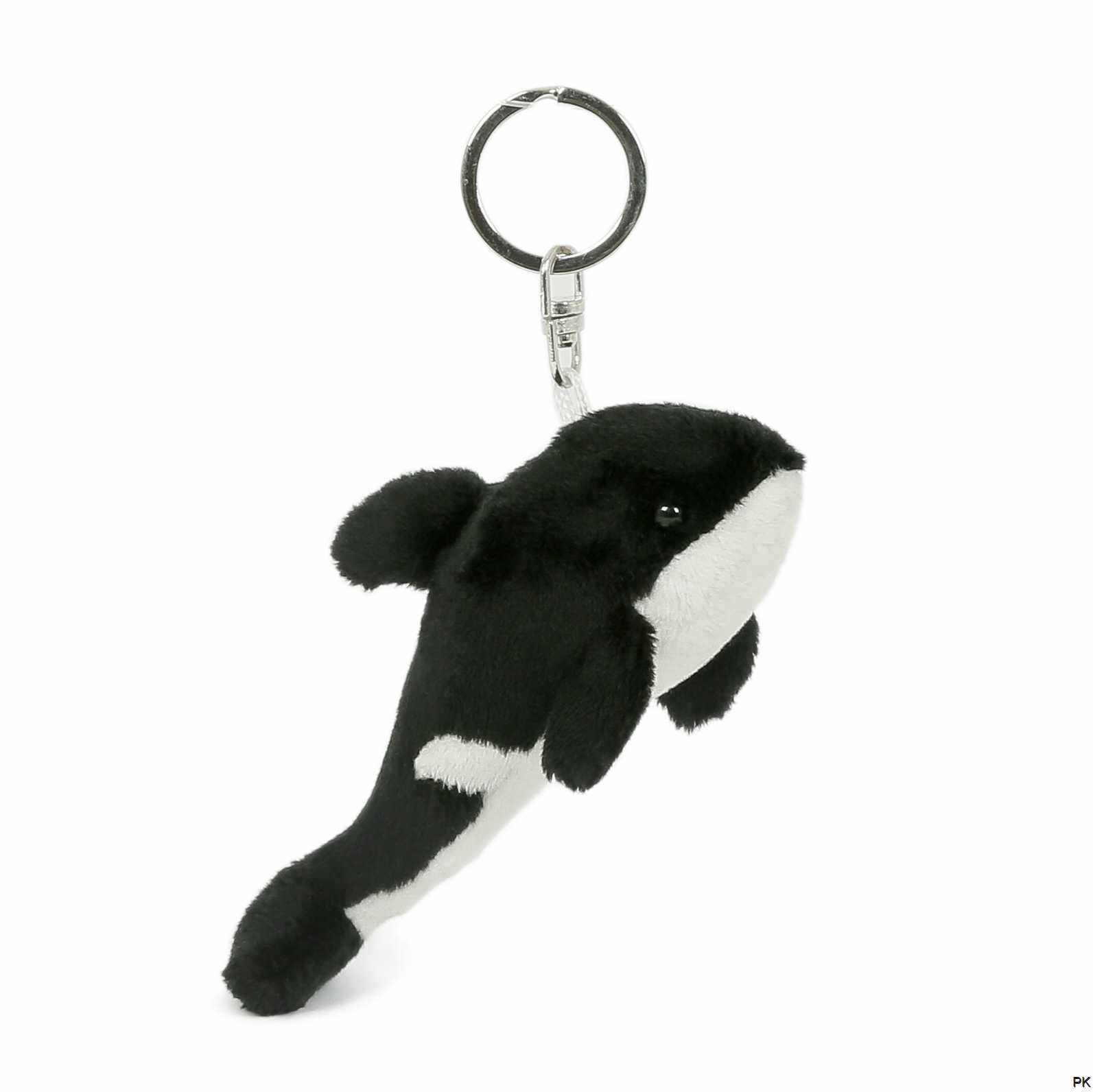 Schlüsselanhänger Wal aus kuschlig weichem Plüsch. Der Körper des Plüsch Wals ist oberseitig schwarz und unterseitig weiß gefärbt.