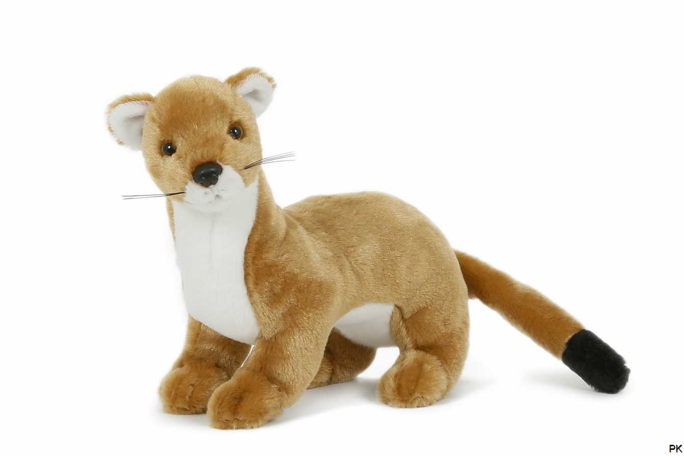 Das Plüschtier Wiesel ist aus kuschlig weichem Plüschmaterial gefertigt und kuschelweich gefüllt. Das Stofftier Wiesel ist oberseitig braun, unterseitig weiß gefärbt. Das Plüsch Wiesel hat schwarze Knopfaugen, sowie schwarze Schnurrhaare und eine schwarze Nasenspitze.