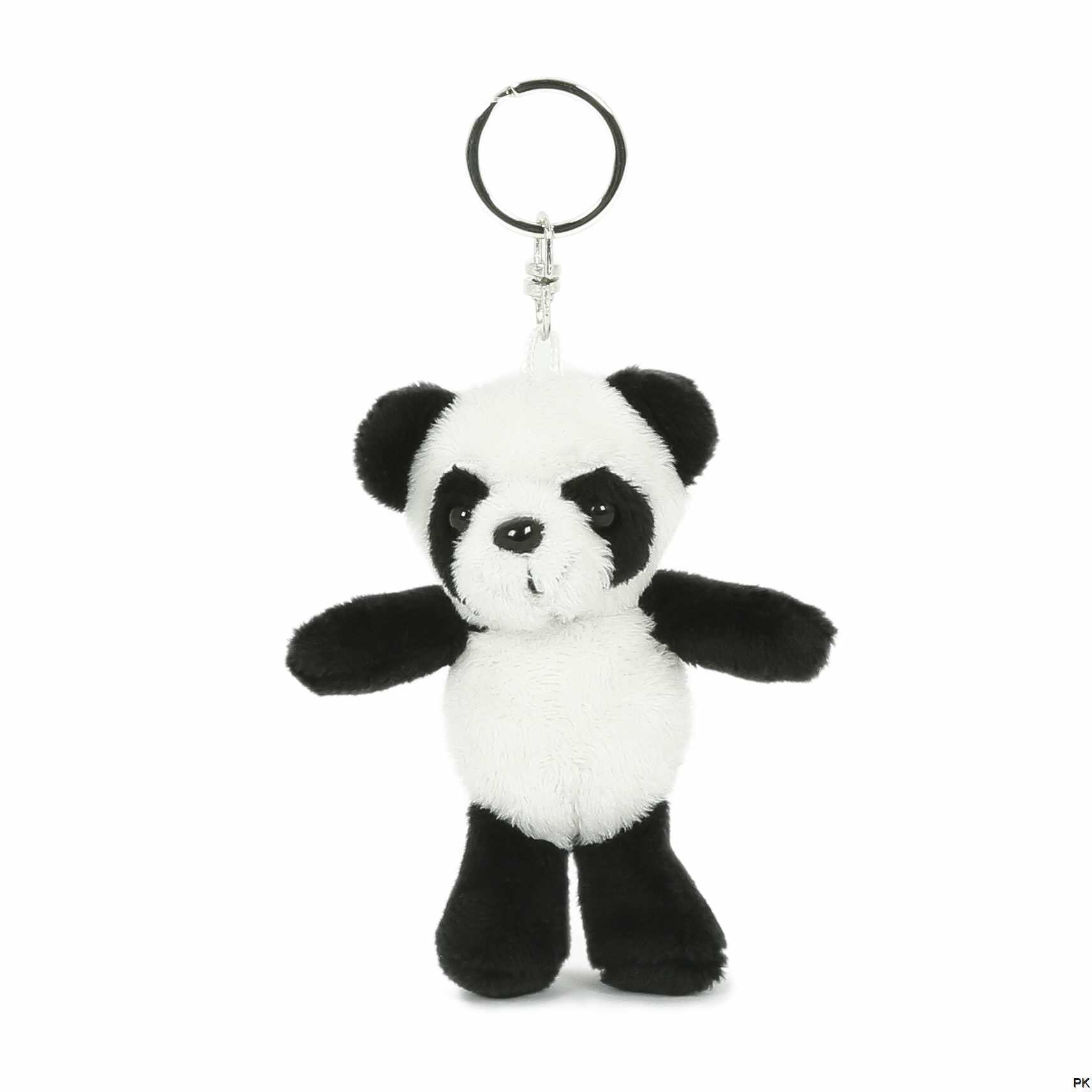 Schlüsselanhänger Panda aus kuschlig weichem Plüsch. Der Körper des Plüsch Pandas ist weiß, Arme, Beine, Ohren, Gesichtsmaske, Augen, Nase und Mund schwarz.