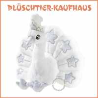 Das Stofftier Pfau ist mit Sternchen auf den Federn und einer Krone bestickt.