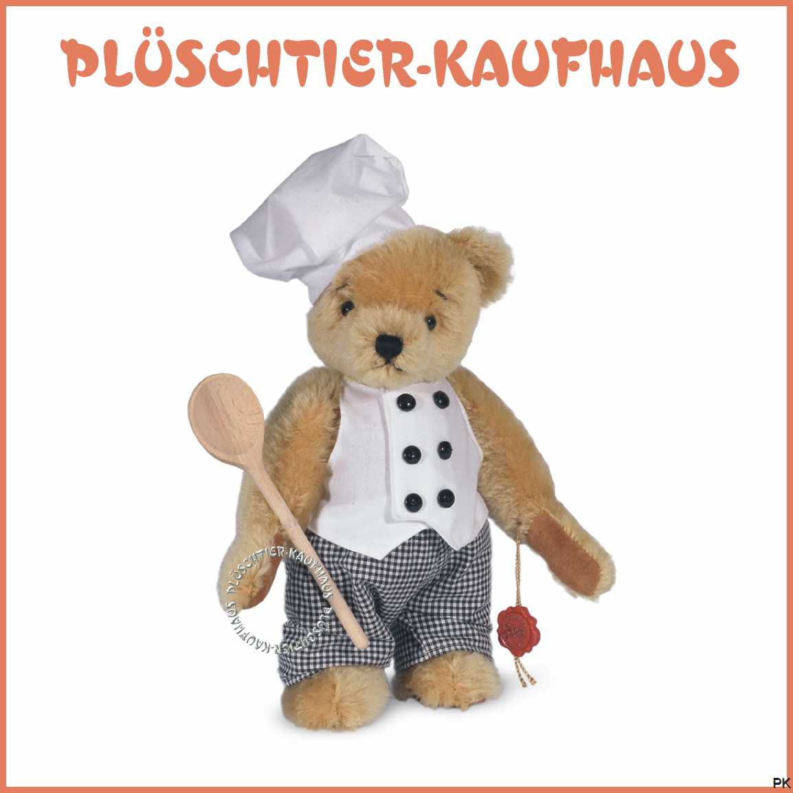 Teddybär "Koch", mit Gourmetrezept, aus Mohairplüsch gefertigt und mit Holzwolle gefüllt. Der Teddybär ist 27 cm groß.